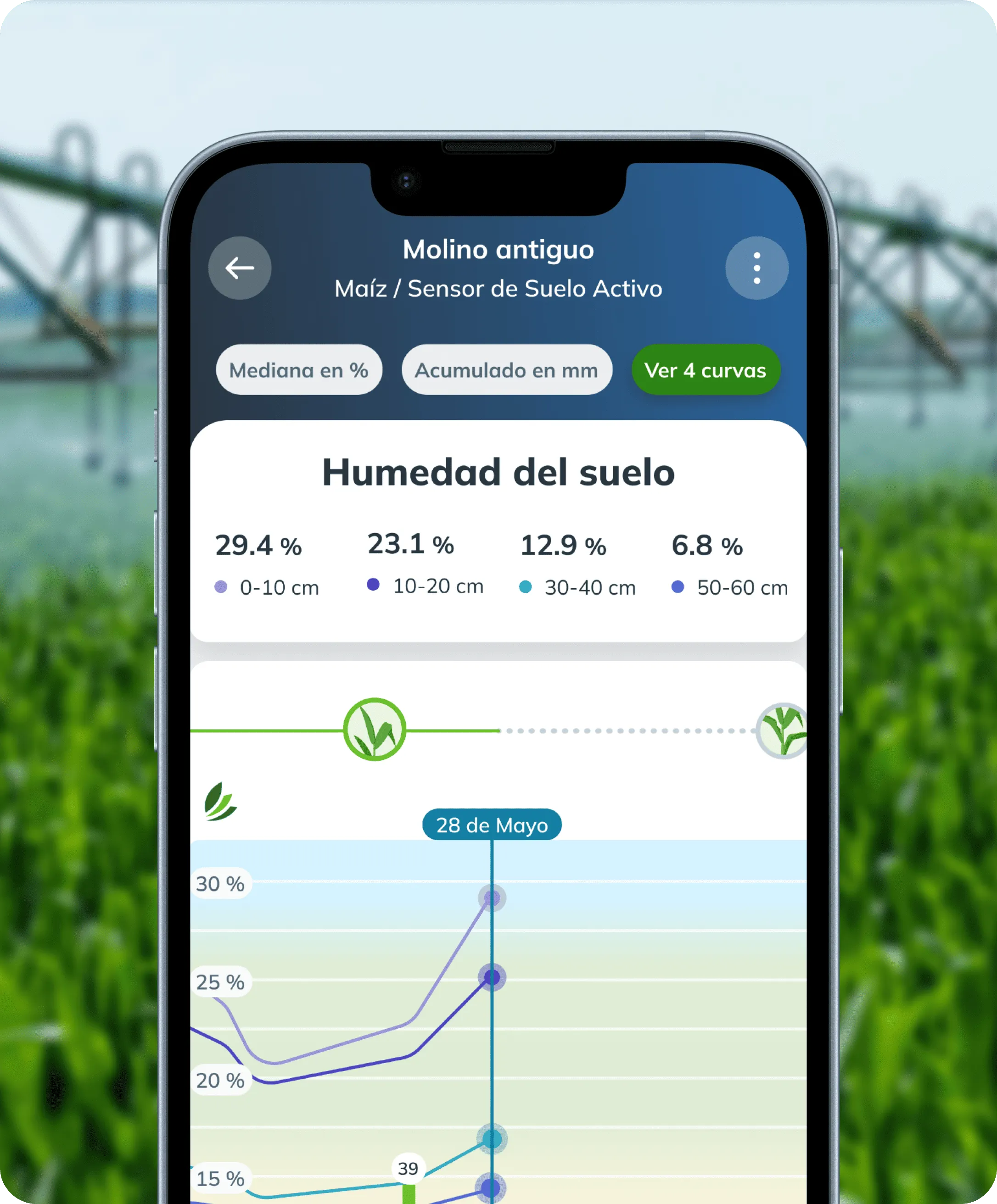 • La sonda capacitiva (60 cm) mide la humedad y la temperatura de sus suelos a tres alturas diferentes, para conocer las necesidades de agua e irrigar en el momento adecuado.